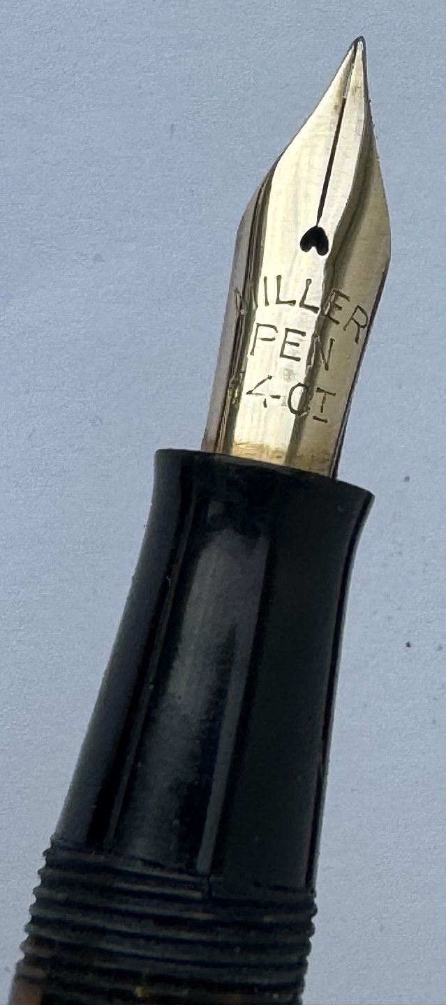 REN ART DECO STIL: 10 kantet og grøn marmoreret Miller nr. 697 fyldepen fra omkring 1940. I god stand uden skader eller reparationer. Alle dele originale til denne model inklusive en 14 karats guldspids (ca. 0,30 gram). Ny gummisæk skal indsættes før den igen kan optage blæk og skrive påny. Ny gummisæk kan indsættes for et tillæg på kr. 250,00. Fyldepennen er 12,3 cm lang.