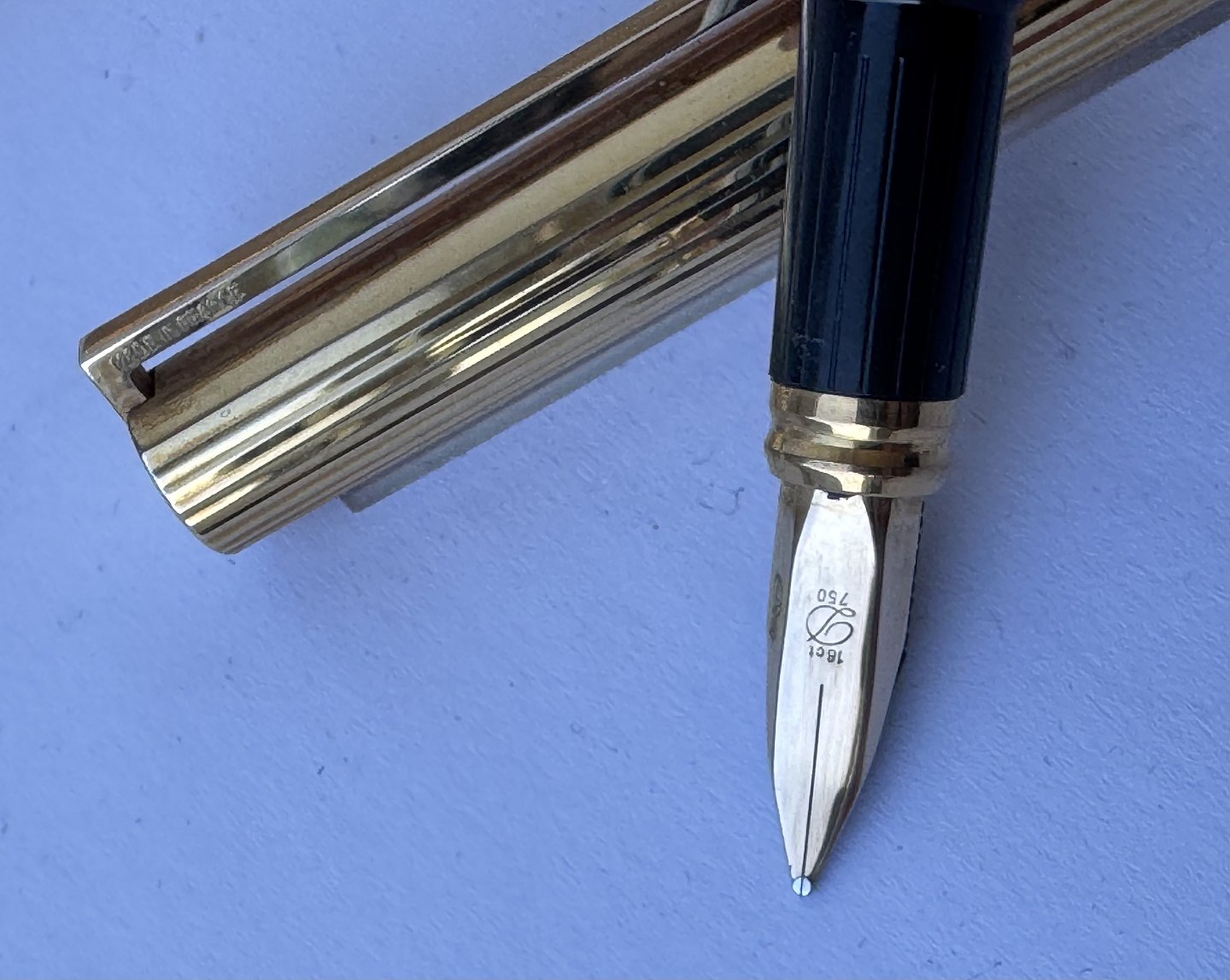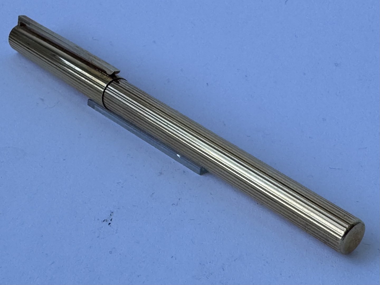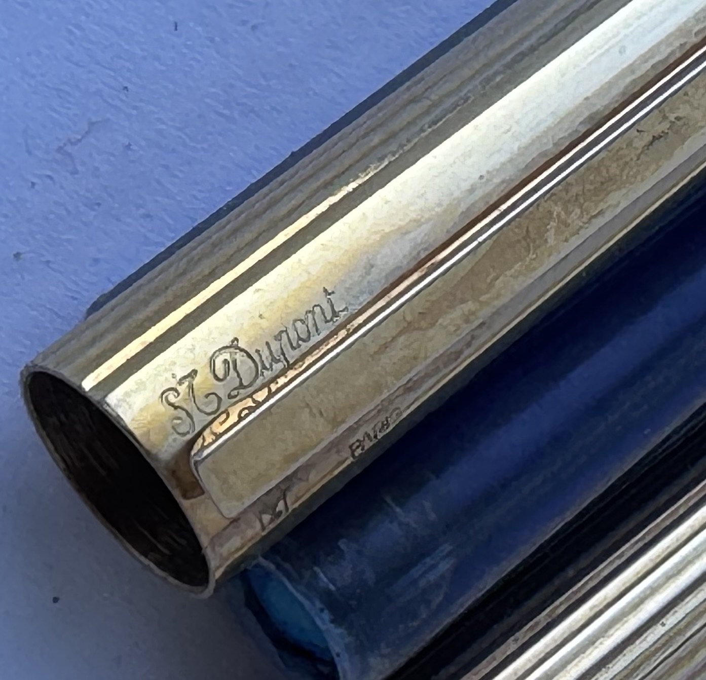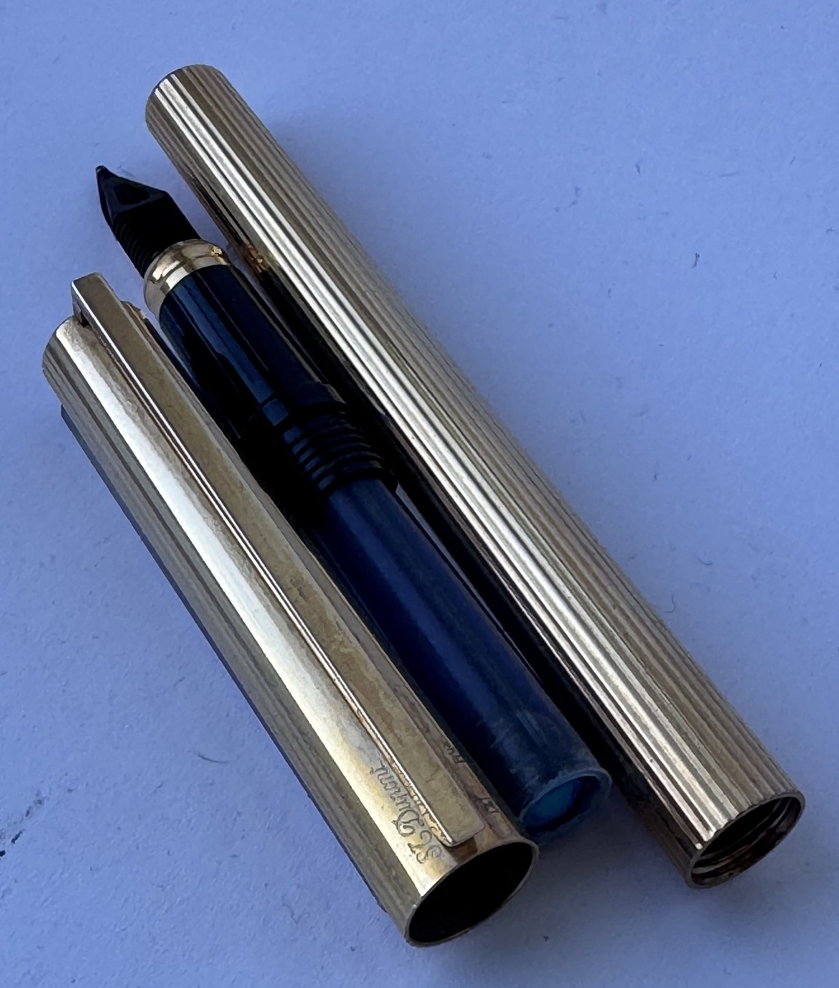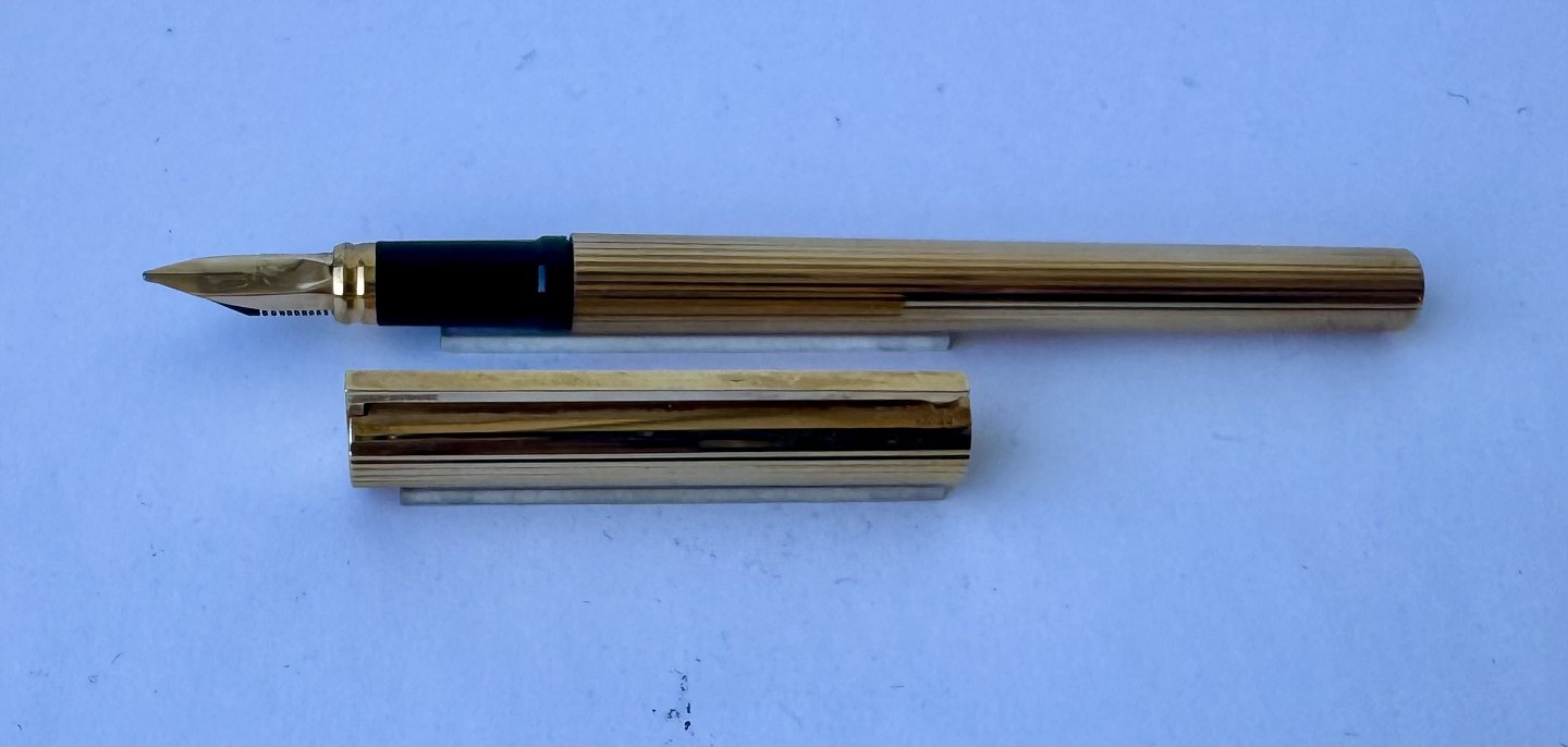 Slank S.T. Dupont De Paris 925 Sterling guld-double fyldepen fremstillet i 1970’erne. Fremstår i god og skriveklar stand, når der bliver indsat en ny blæk-patron. Ingen skader eller reparationer .L. 13,9 cm