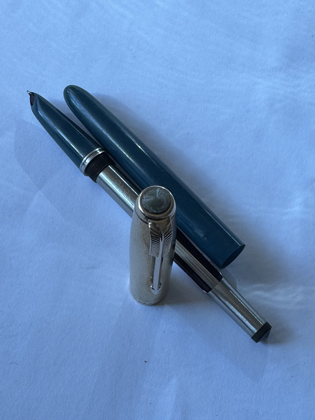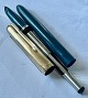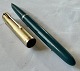 Skriveklar vintage fyldepen: Grøn Parker 51 fyldepen med guld double hætte. I god stand. Klar til at blive brugt. Ingen skader eller reparationer. Almindelige brugsspor. L. 14 cm.