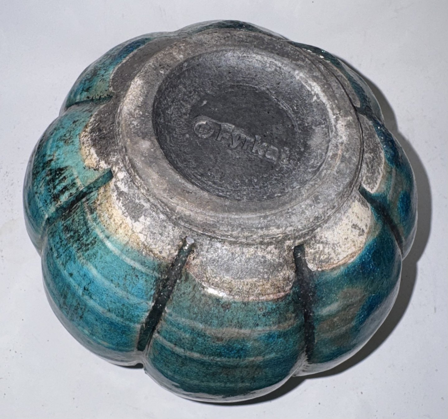 Turkis vase i raku fra FYRKAT. I god stand. Fabriksmærket på bunden. Mål: H. 10,2 cm Ø. 14 cm