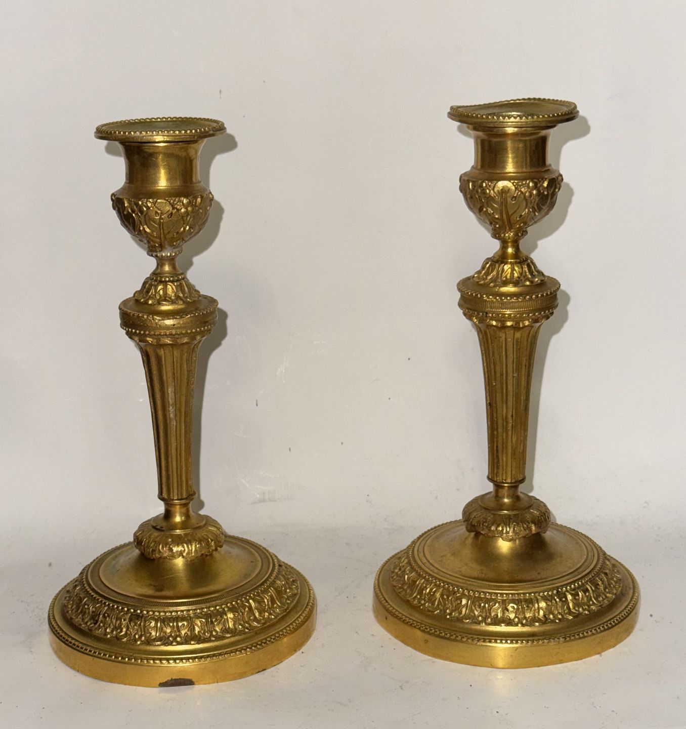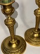 Par forgyldte lysestager i bronze. Fremstillet i Frankrig i første halvdel af 19. Århundrede. Fremstår med lidt brugsspor dog uden skader eller reparationer. H. 18,5 cm