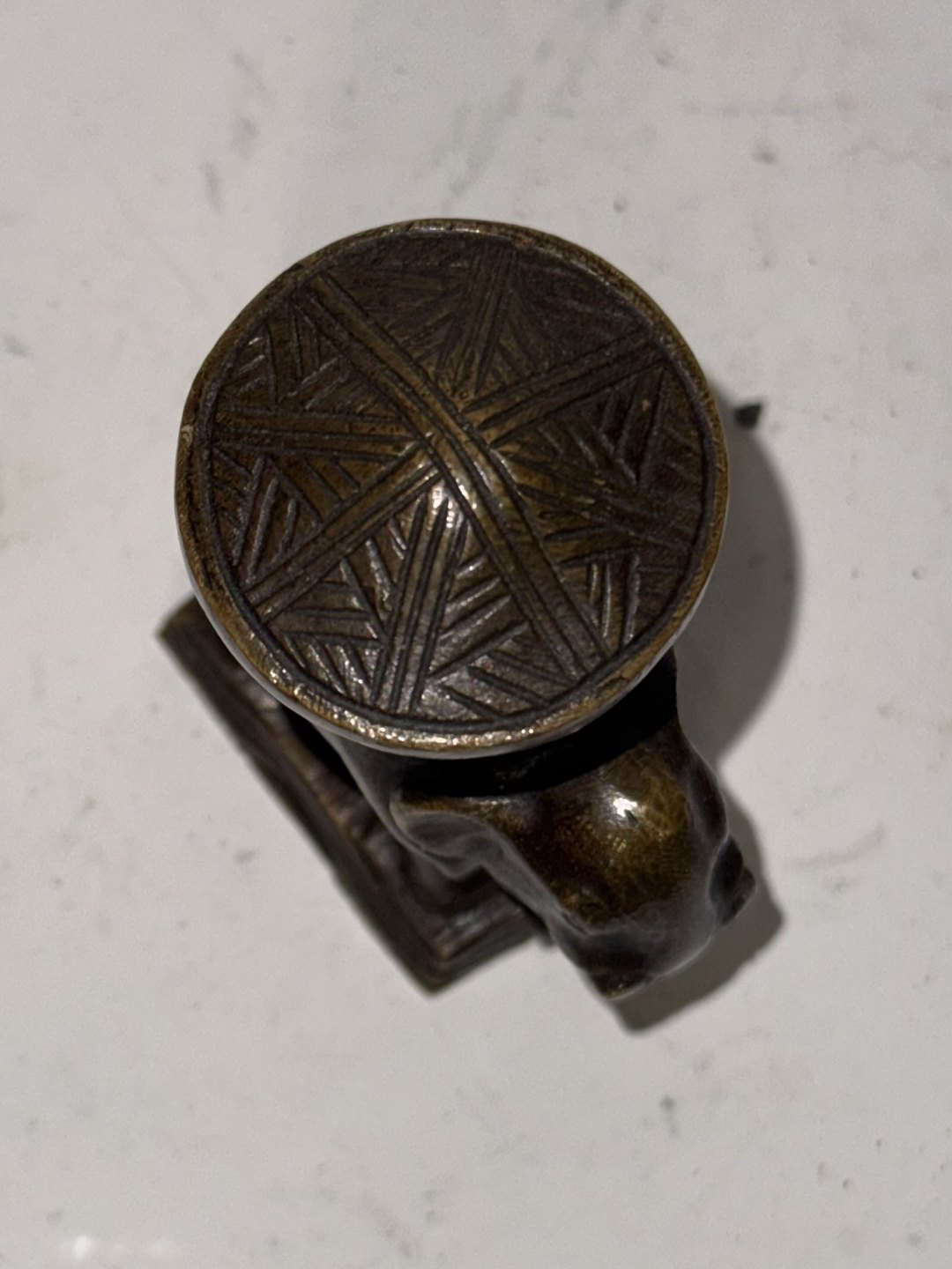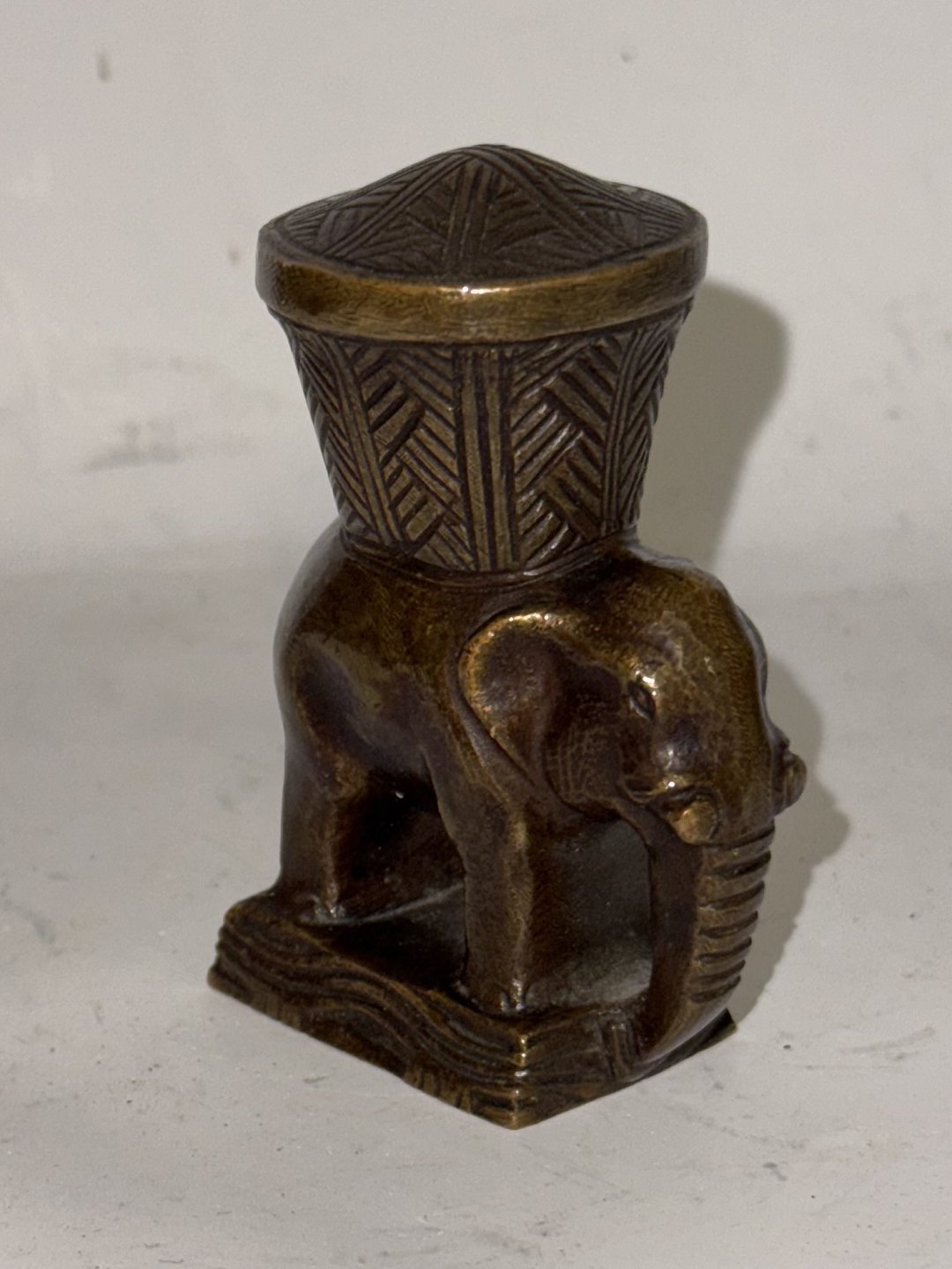 Mogens Ballin (1871-1914): Figur af elefant med kurv på ryggen i bronce. Støbt i ét. I god stand. På bunden indgraveret KH. Ikke stemplet. Muligvis tiltænkt som signet ! Har tidligere solgt lignende figur af Mogens Ballin i tin, der fungerede som strøbøsse. Udgaven i tin havde modelnummer T135. H. 6,8 cm.